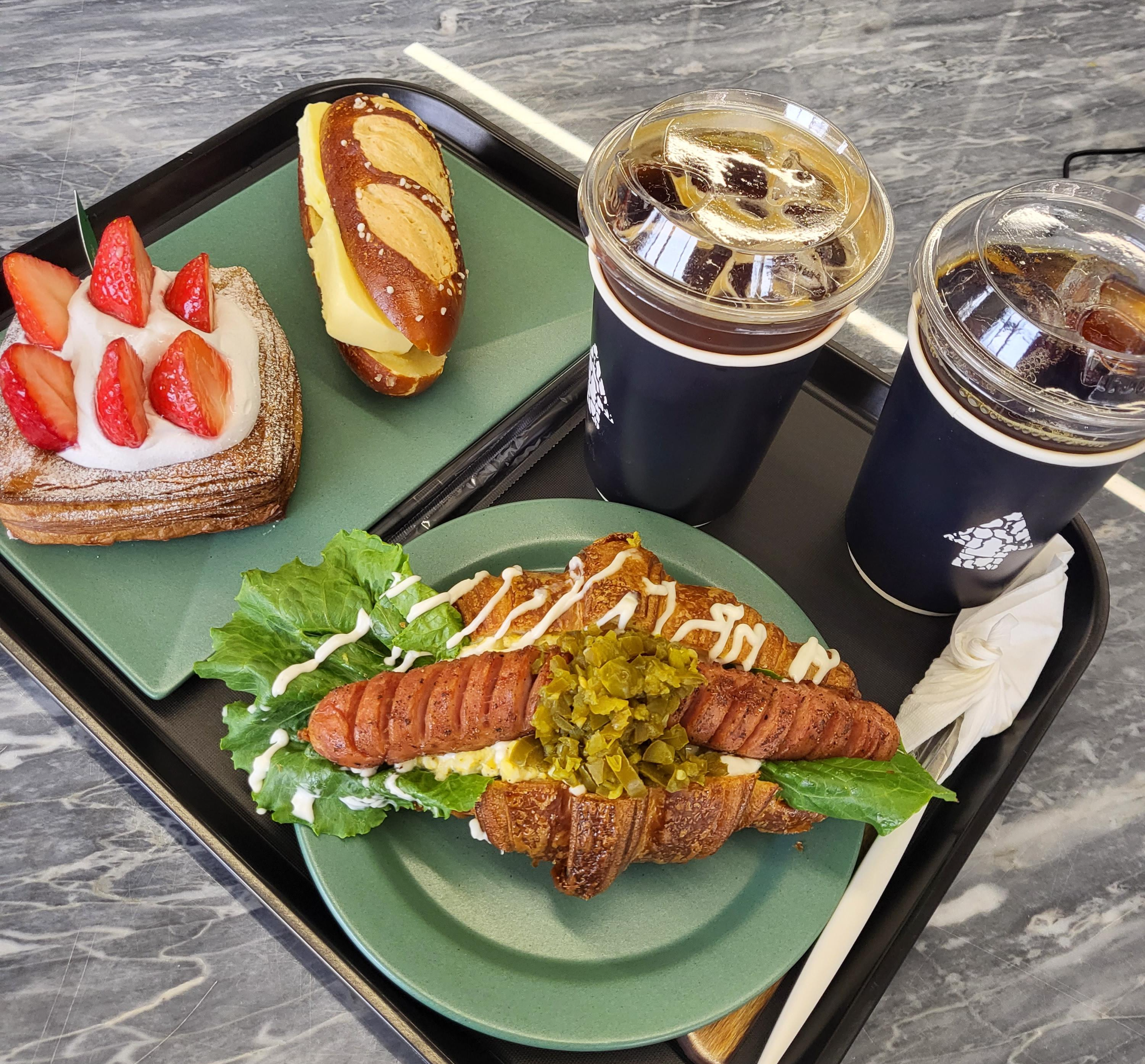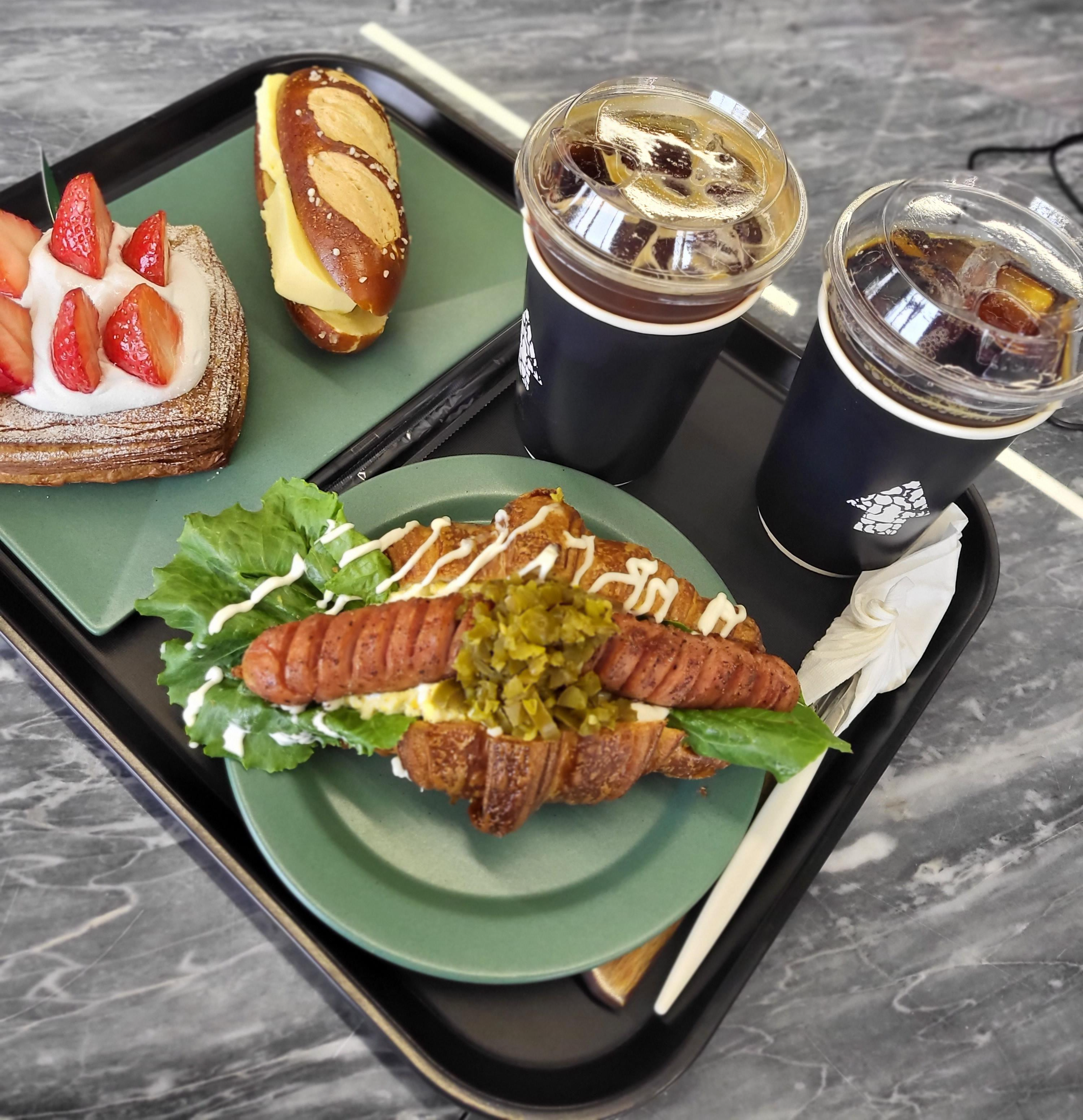 소세지가 올라간 빵이랑 맛있는 크림이 올라간 빵이랑 앙버터 주문 했습니다.